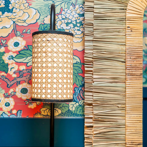 This charming 120-year-old powder room needed a refresh. We transformed the space with new tile, an elegant console sink, and a faucet. We added an eye-catching wallpaper paired with a fresh paint color for added vibrance. A raffia mirror and updated lighting complete the look, while an upgraded crystal doorknob adds a touch of glamour.